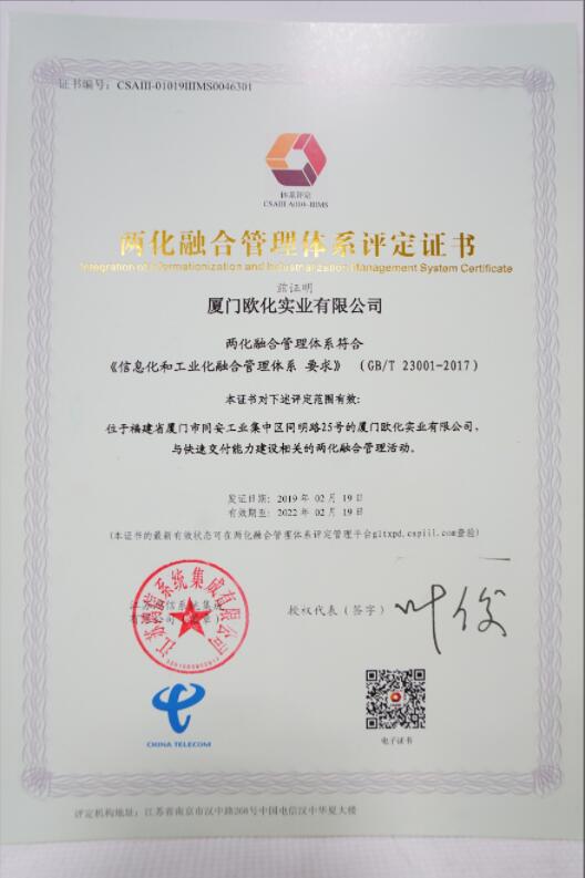 近日,我司獲證“兩化融合管理體系”評定,茲以證明我司兩化融合管理體系符合《信息化和工業(yè)化融合管理體系要求》。
