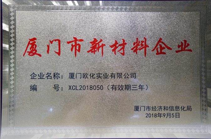 2018年9月5日,廈門市經(jīng)濟和信息化局為我司頒發(fā)“廈門市新材料企業(yè)”證書。