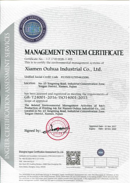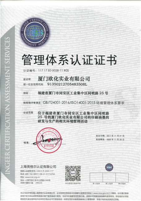 近日,廈門歐化實業(yè)有限公司的印刷油墨研發(fā)與生產(chǎn)的相關(guān)環(huán)境管理活動通過ISO 14001:2015認(rèn)證。