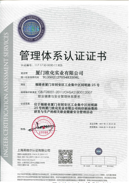 近日,廈門歐化實(shí)業(yè)有限公司的印刷油墨研發(fā)與生產(chǎn)的相關(guān)職業(yè)健康安全管理活動(dòng)通過(guò)OHSAS 18001:2007認(rèn)證。