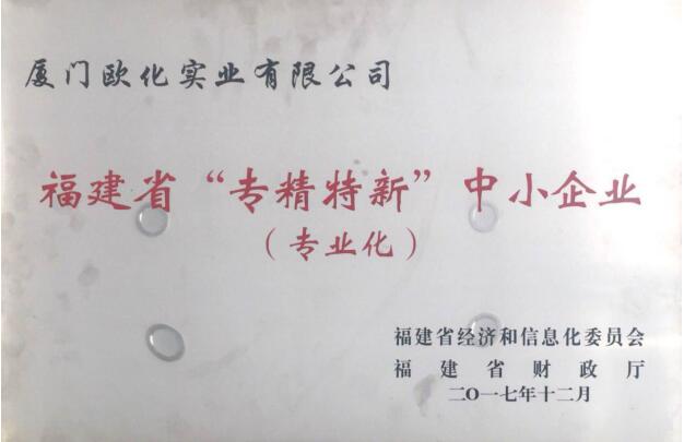 2017年12月,福建省經(jīng)濟和信息化委員會、福建省財政廳授予廈門歐化實業(yè)有限公司,“福建省專精特新中小企業(yè)(專業(yè)化)”榮譽。